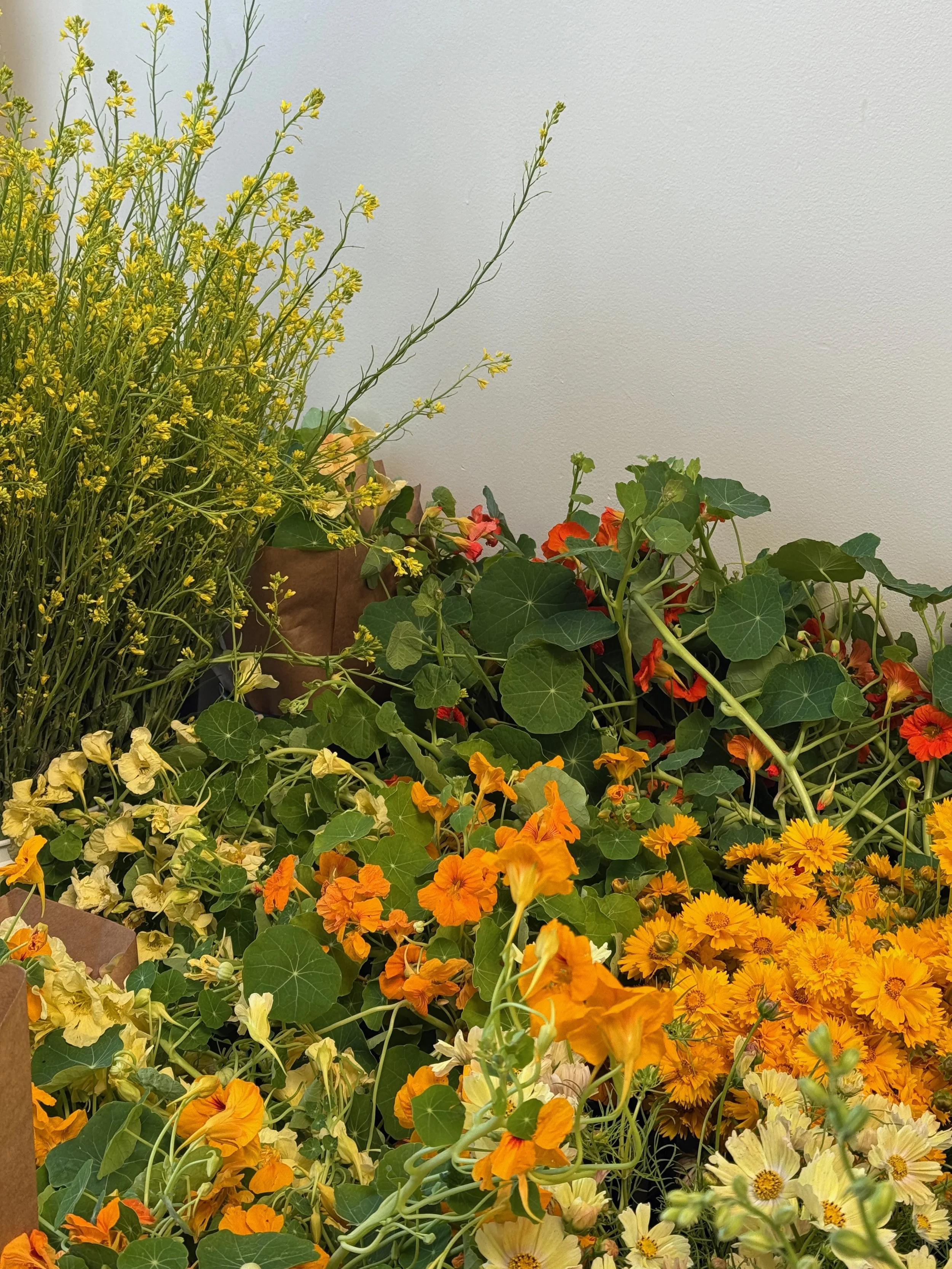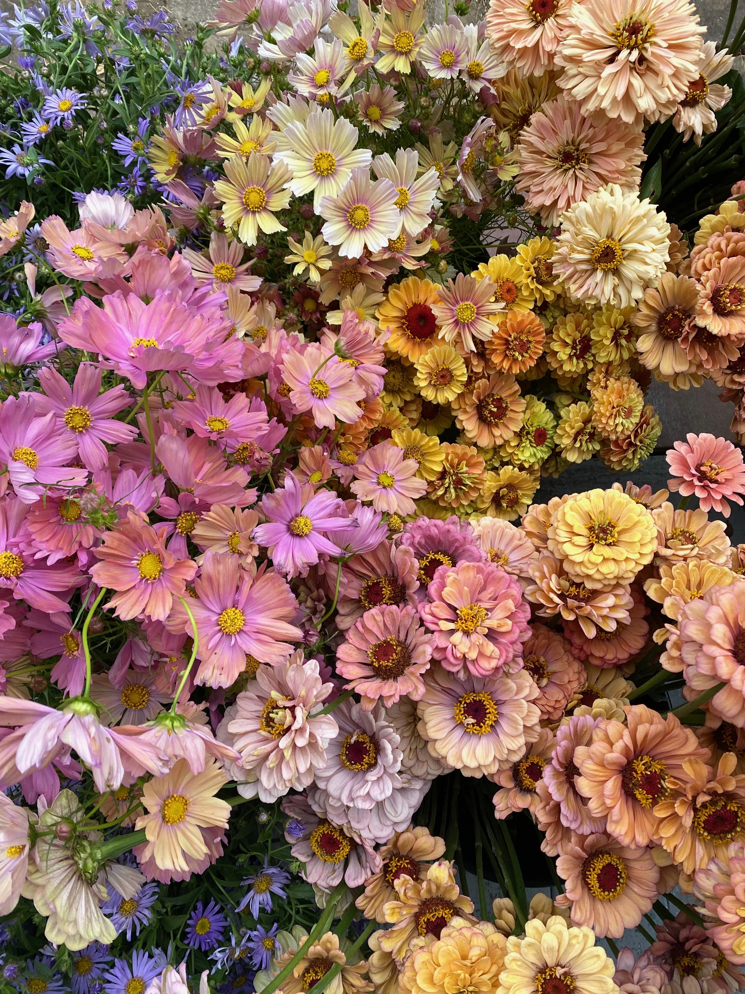 Each bucket is filled with a seasonal mix of fresh, locally grown flowers that you can arrange into bouquets, centerpieces, or any designs that make your day uniquely yours. Buckets include an assortment of focal and filler flowers, and while you may request a color palette, all flower selections are based on what is blooming at the time. Photo examples are intended to reflect color stories only, not exact varieties.